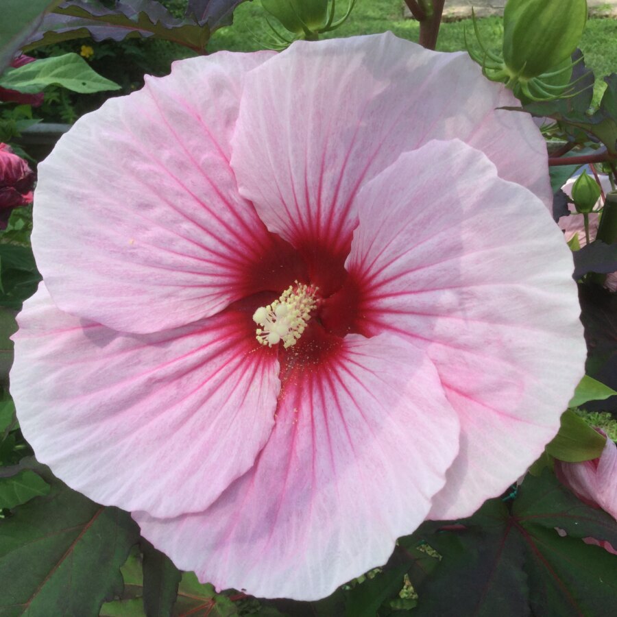 L’ibisco (Hibiscus rosasinensis L.)  è un piccolo albero dai vistosi fiori rosso-rosei appartenente alla famiglia delle Malvaceae. Il genere fu così chiamato da Linneo che impiegò l’antico nome greco di un’altra specie appartenente alla stessa famiglia (Malvaceae), l’altea (Althaea officinalis L.) chiamata appunto ibiscos; il termine specifico ricorda il colore dei fiori ed il probabile paese di origine. Già introdotto in Italia dall’Estremo Oriente nel XVII secolo, in Lucchesia è documentata la presenza a partire dalla prima metà dell’800. Presente anche l’ibisco della Siria (Ibiscus  siriacus L.) in effetti anch’esso  proveniente dall’Estremo Oriente, ma più resistente al freddo e per questo coltivato anche alla Malmaison.