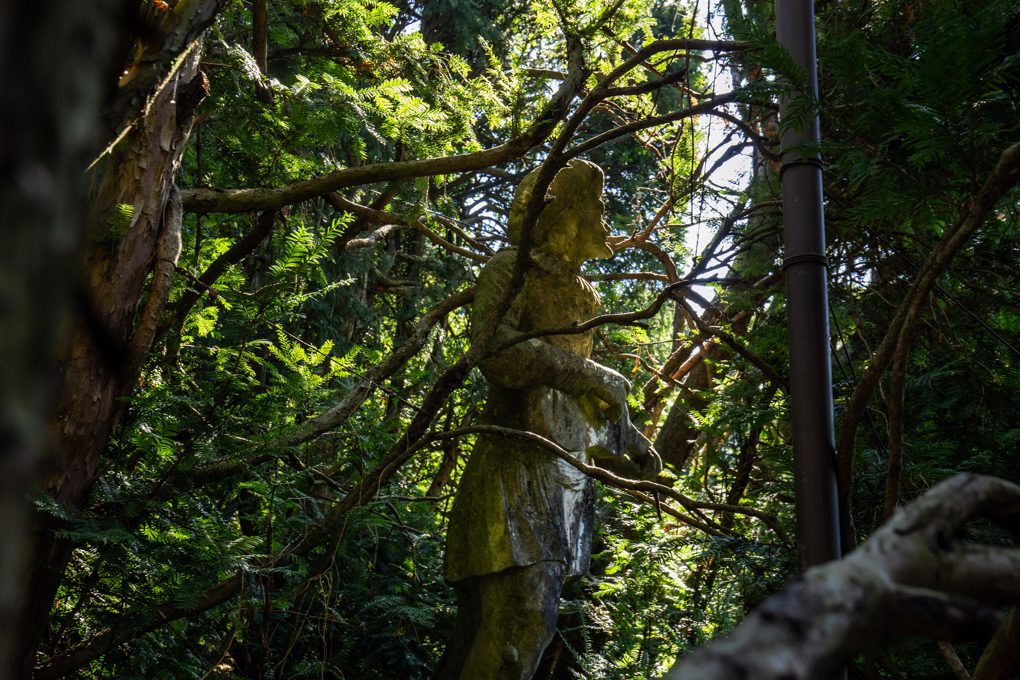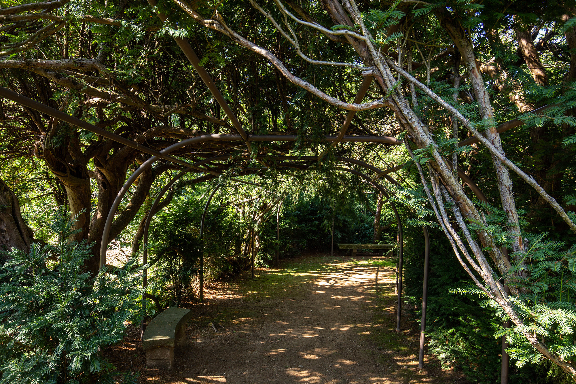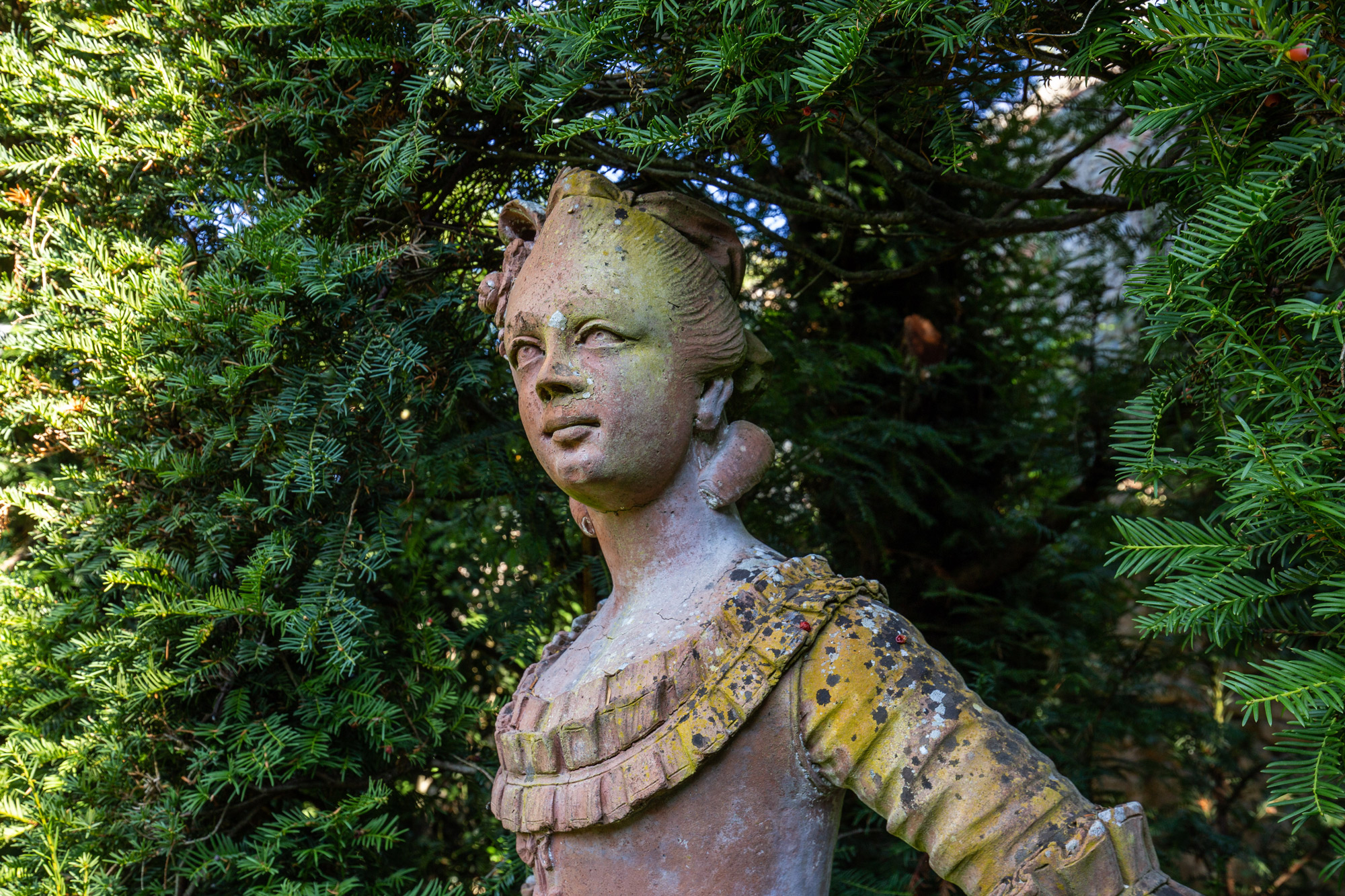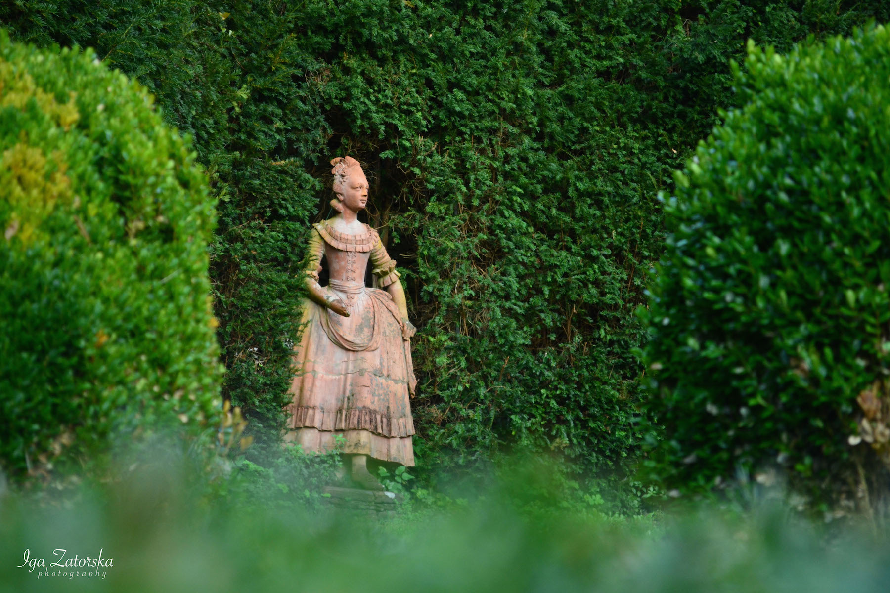 Le siepi di tasso sono tagliate in modo da creare delle alte pareti verdi con finestre ad arco. Al confine tra scena e platea due forme topiarie rappresentano il podio per il direttore d’orchestra e la buca per il suggeritore, mentre le piccole sfere di bosso imitano i paraventi dei riflettori.