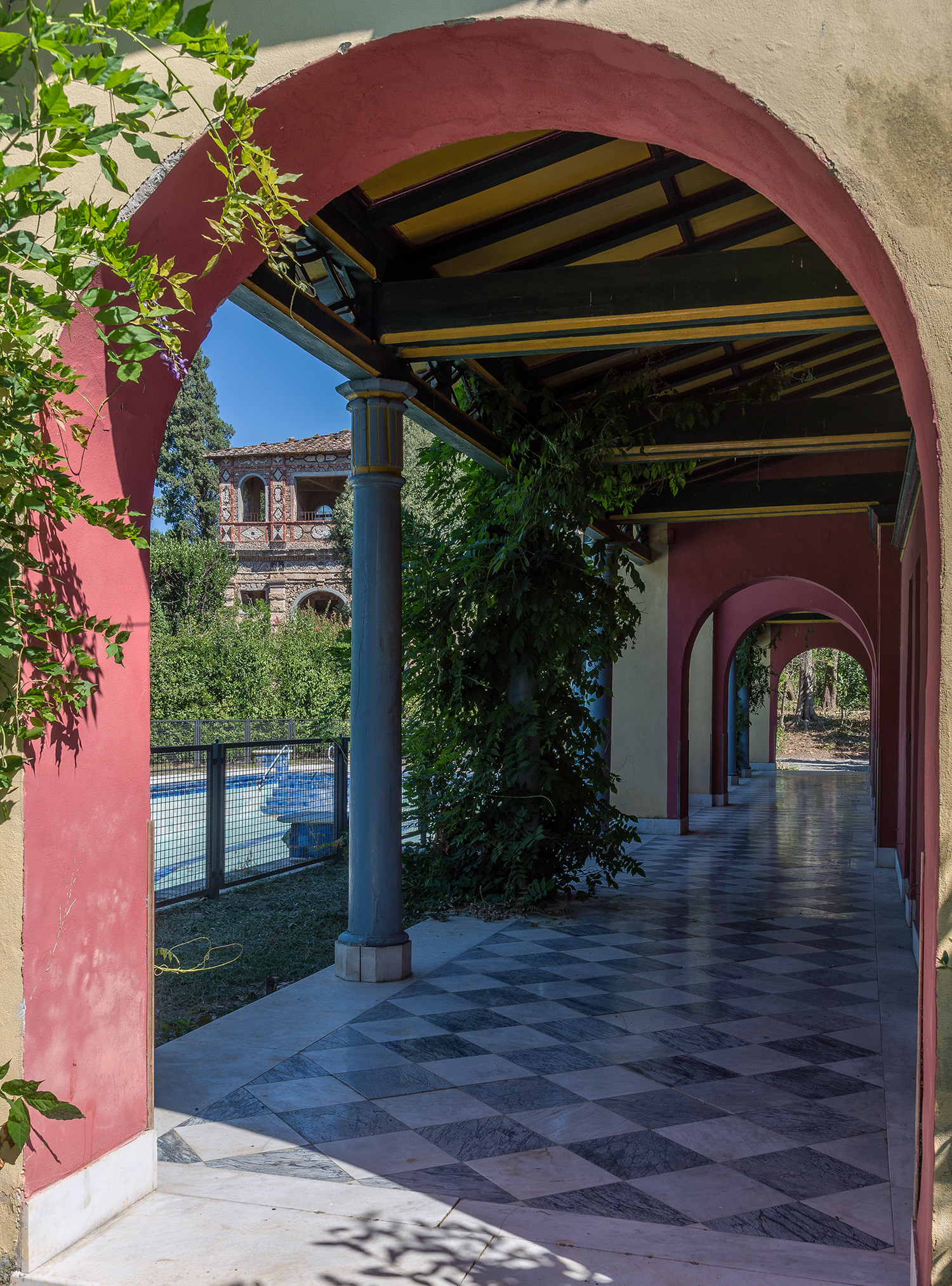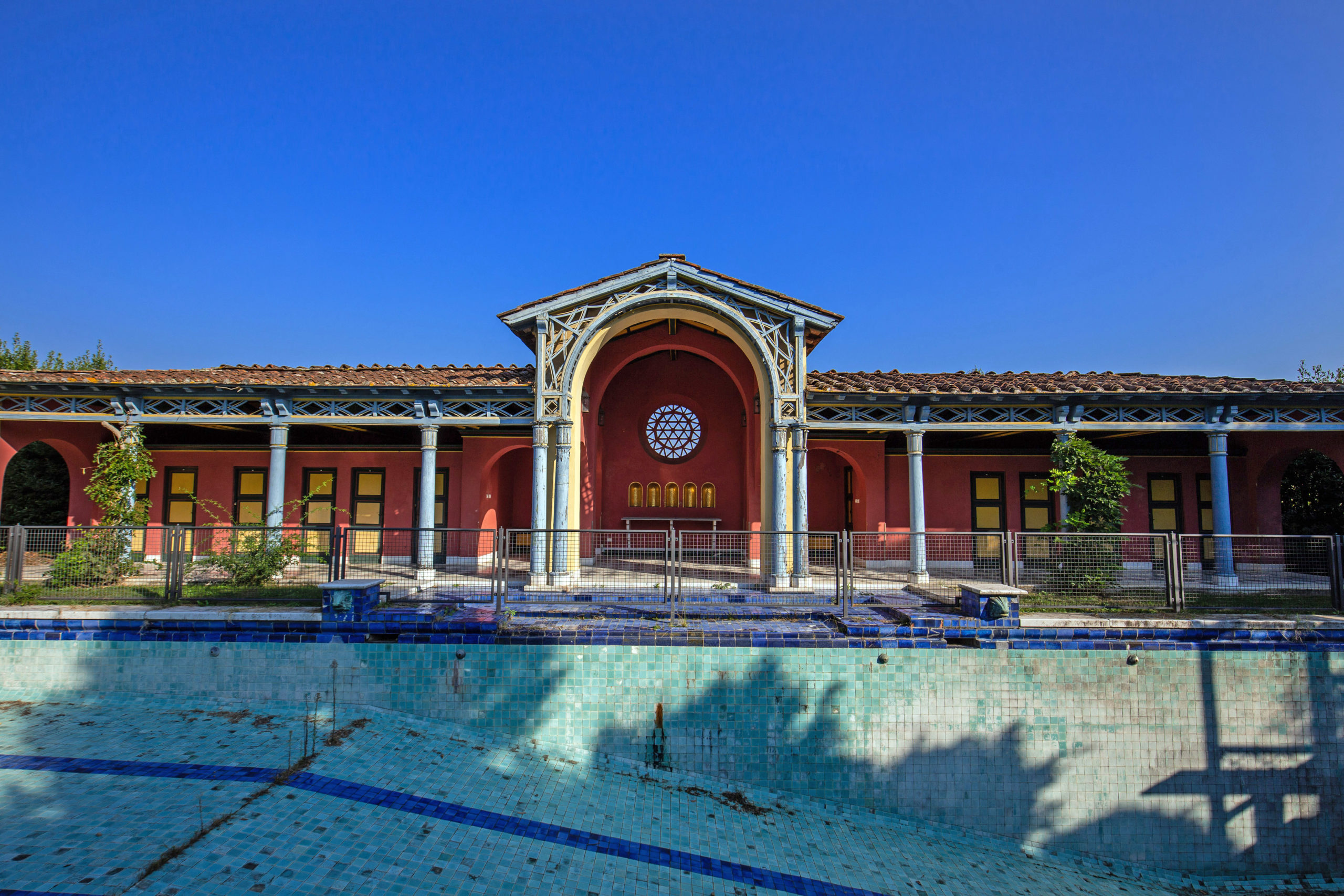 L’intention était de réinterpréter en clé moderne cette partie du parc en créant une aire dédiée au sport. La Piscine, avec ses vestiaires insolites au style Liberty et aux couleurs flamboyantes et l’original plongeoir en bois, était innovante pour la période car équipée d’un puissant thermosiphon pour le réchauffement des eaux.
