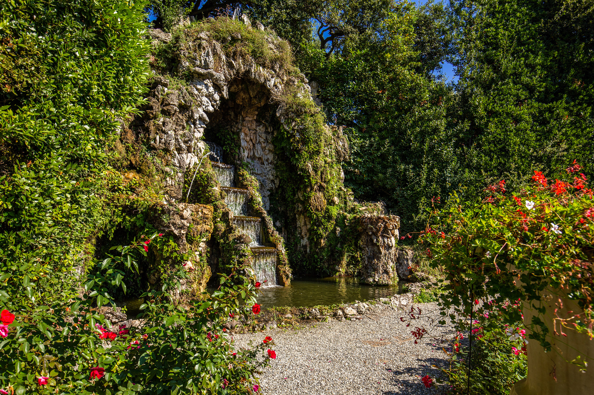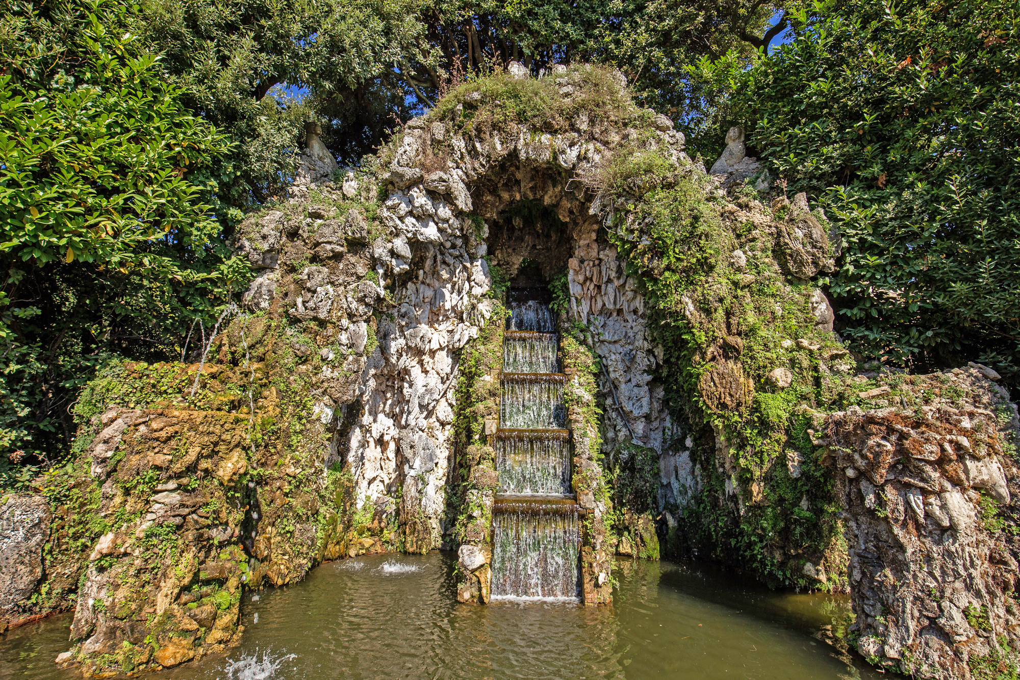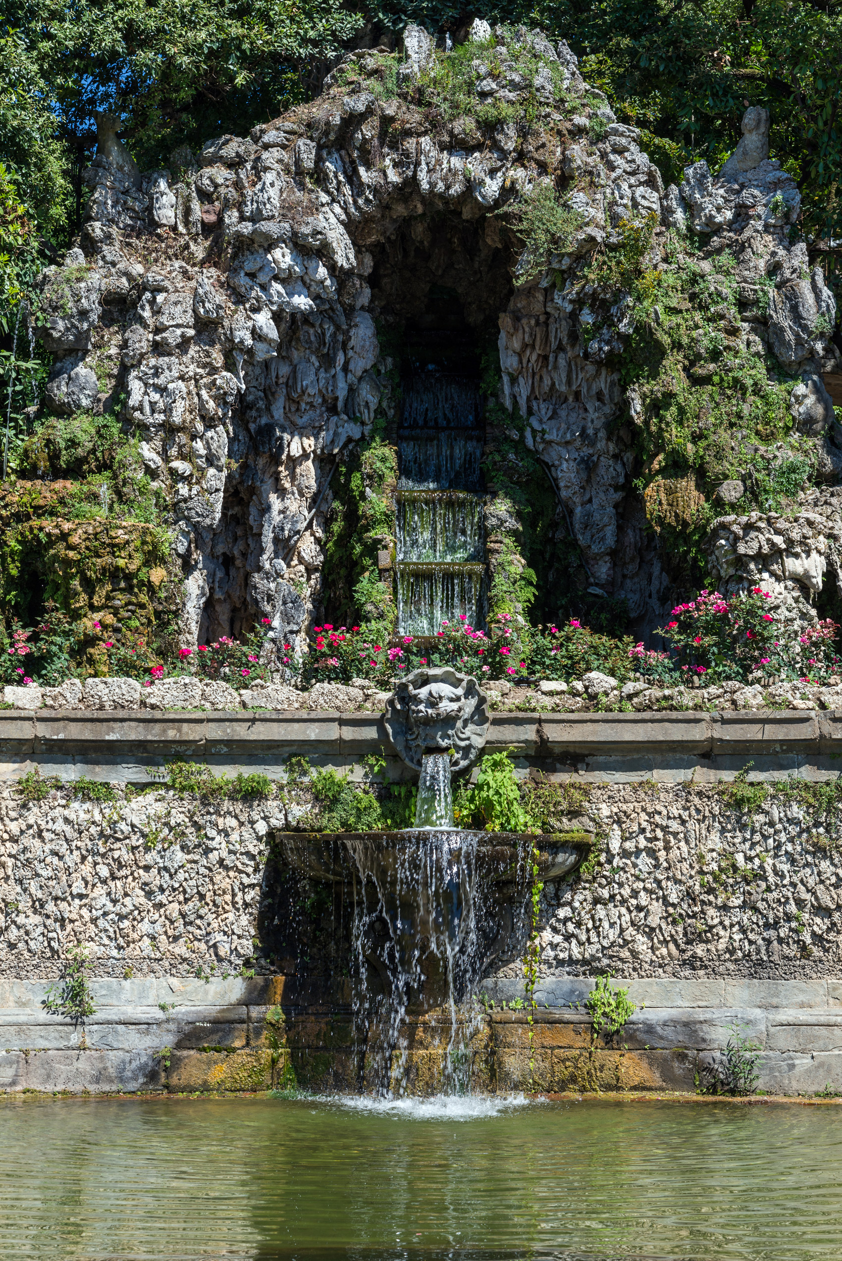 Plus bas, l’eau coule à travers les cinq masques en pierre en se reversant dans des petits bassins en coquille trilobée. Elle conflue ensuite dans le grand bassin en demi-cercle d’où elle se ramifie pour alimenter toutes les fontaines et les canaux du parc, en descendant par gravité jusqu’au Lac du Parc.