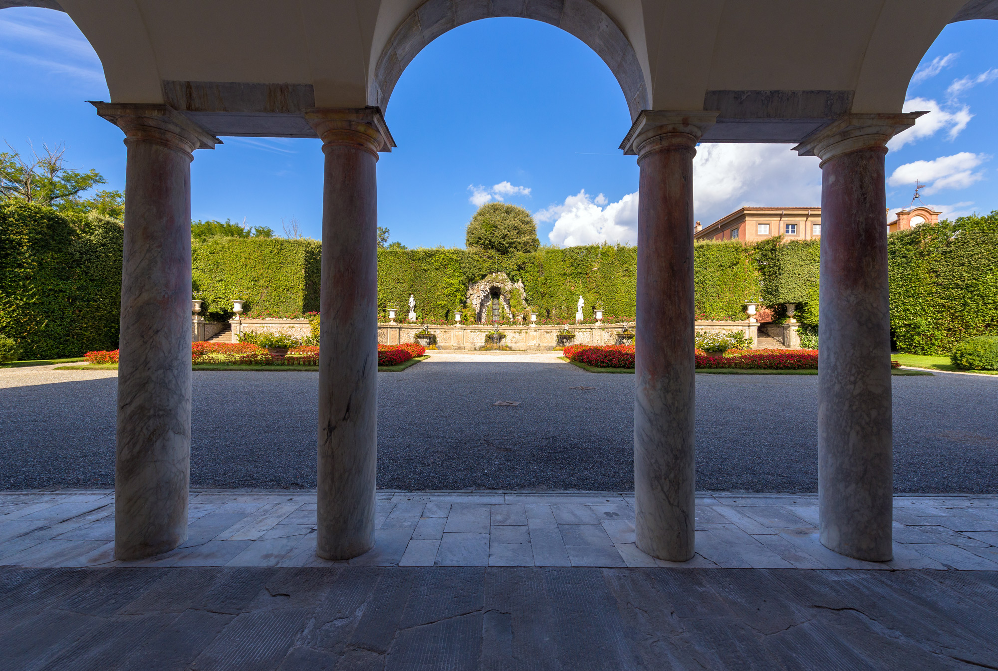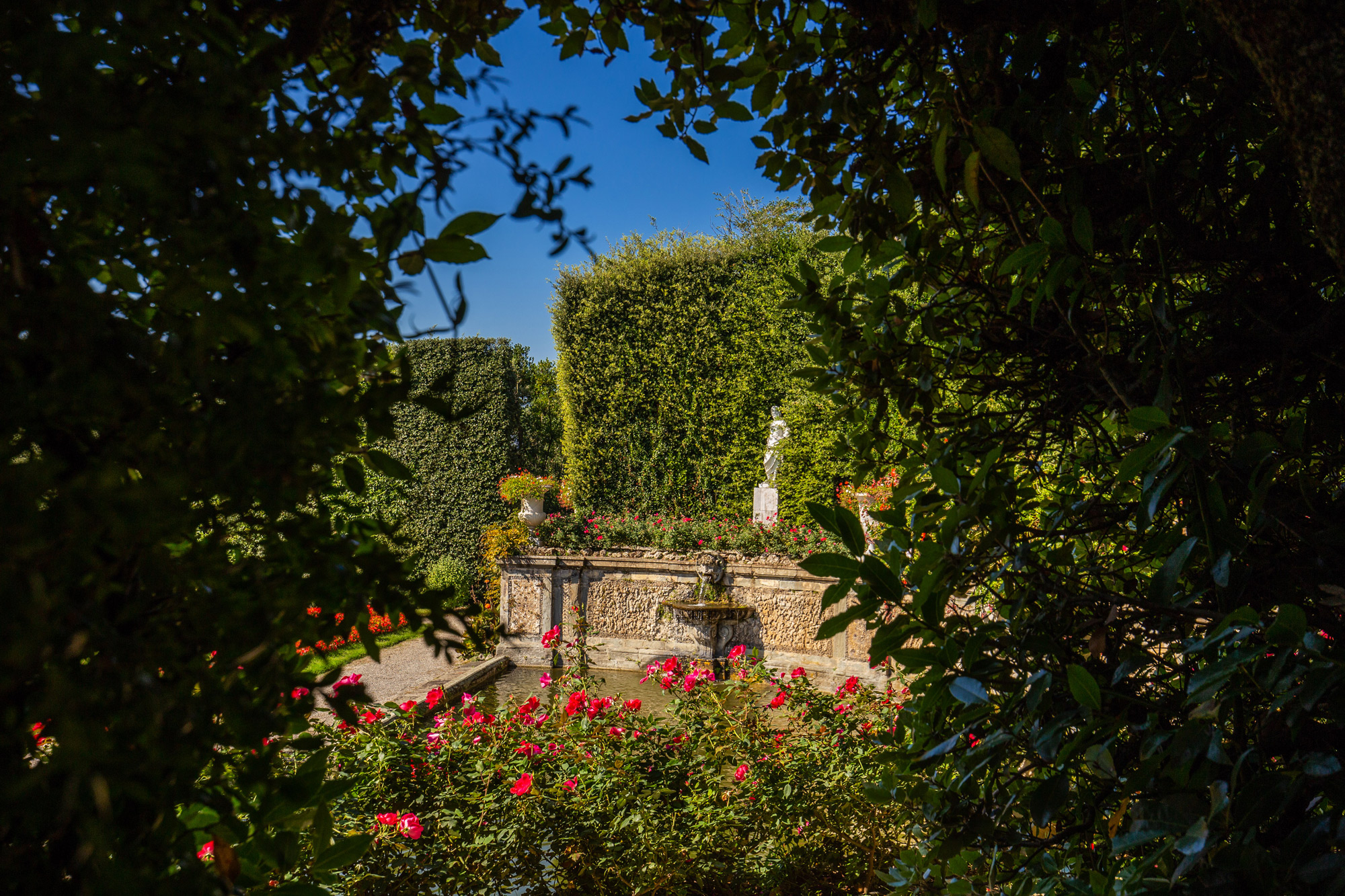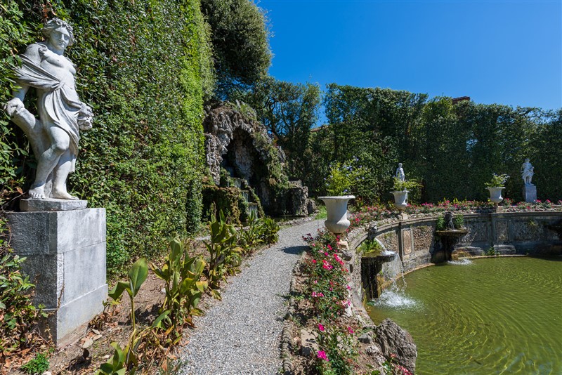 L’architecture entière est contenue dans des haies de chênes verts et lauriers enrichies de niches qui abritent les statues des divinités grecques de Jupiter, Saturne, Adonis et Pomone.